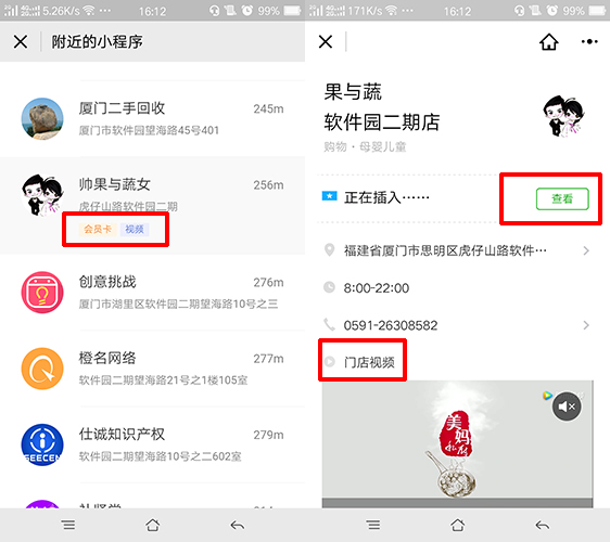 说到门店小程序,我们可以在“附近的小程序”中发现,一些支持用户领取会员卡,或者添加了视频展示的门店小程序在列表中都会显示“会员卡”和“视频”的字眼,直接点击领取就能将会员卡放入自己的“卡包”中。