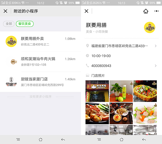 如果说门店小程序可以添加视频,让商家能够个性化地展示自己的门店,那么支持跳转到小程序中就又多了想象空间。例如,一个餐饮类的门店小程序,可以将门店小程序展示在“附近的小程序”中,用户通过定位发现这个小程序,并打算到这家门店消费,到这里,门店小程序帮助商家实现了用户的一次转化。