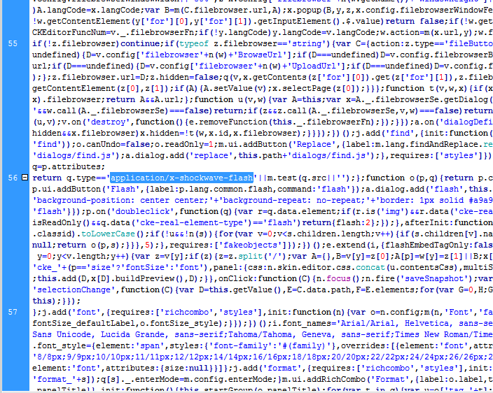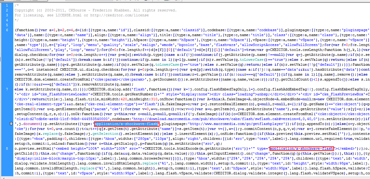 然后:找到网站根目录/include/ckeditor/plugins/flash/dialogs/flash.js 文件,跟上面步骤一样查找(CTRL+F) :